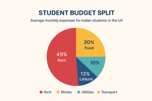 On average, Indian students in the UK spend about £950–1,250 per month (₹1L–1.2L). Rent eats up almost half of this budget, while the rest goes into groceries, utilities, transport, and a little fun (yes, you’ll want nights out and Netflix too ).